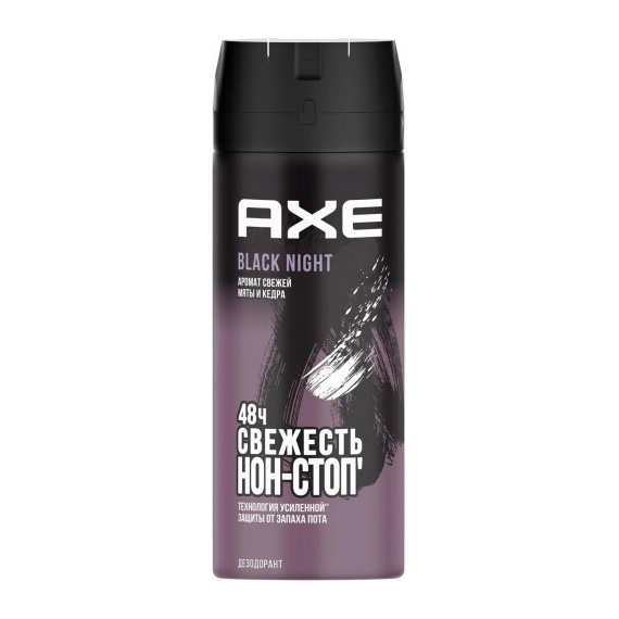 Дезодорант спрей AXE Black Night подарит классный аромат и 48 часовзащиты против запаха пота*. AXE защитит твою кожу от бактерий, вызывающих неприятный запах при потоотделении.