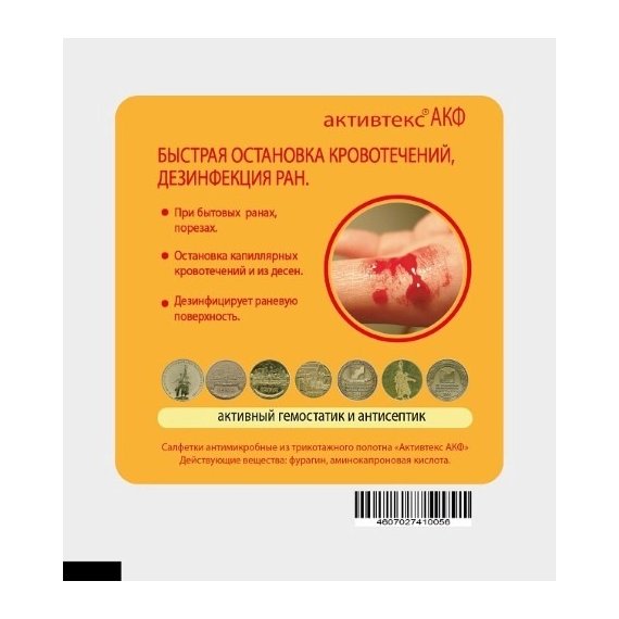 АКТИВТЕКС АКФ САЛФЕТКА ОСТАНОВКА КРОВОТЕЧЕНИЙ - быстрая остановка кровотечений, дезинфекция ранЗа счет комбинированного воздействия антимикробного геля и лекарственных веществ, достигается быстрая остановка кровотечений и ускоренное заживление.Время использования до 72 часов.ХАРАКТЕРИСТИКИ:Размер изделия 10х10 смМатериал: Текстильный носитель.Рисунок: НетДиапазон температур: от -15 до +30Относительная влажность воздуха: до 95%Цвет: желтыйИзделие быстро останавливает кровь при порезах, носовыx и прочиx каппиллярных кровотечениях, а также предотвращает развитие инфекций.Аминокапроновая кислота обеспечивает гемостатический эффект, а фурагин - подавление в ране болезнетворных микроорганизмов.Активный гемостатик и антисептик-При бытовых ранах, порезах-Остановка капилярных кровотечений и из дёсен-Дезинфицирует раневую поверхность