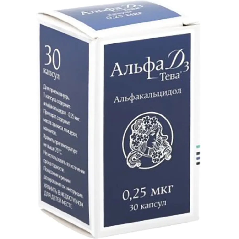 Альфа Д3 Тева капсулы 0.25мкг 30шт регулирует кальциево-фосфорный обмен, снижает концентрацию в крови гормона, производимого паращитовидными железами. Препарат укрепляет кости, уменьшая частотность трещин, переломов и других повреждений. Активный компонент альфакальцидол после полноценной терапии восстанавливает мышечный тон и волокна.Показания:- стеопороз;- остеодистрофия;- гипопаратиреоз;- рахит и недостаток витамина D;- синдром Фанкони.Таблетки усиливают минерализацию костей, снижая риск трещин в костях. При правильной дозировке у пациента значительно уменьшаются костные и мышечные боли, улучшается координация движений.