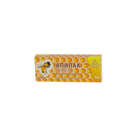 Апилак (пчелиное маточное молочко) представляет собой секрет, вырабатываемый аллотрофическими железами рабочих пчел. В составе апилака обнаружены витамины, макро- и микроэлементы, аминокислоты, в т. ч. незаменимые, ряд других биологически активных веществ. Обладает общетонизирующим действием, стимулирует клеточный обмен.