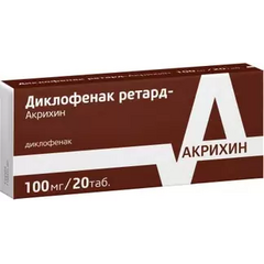 Диклофенак ретард - Акрихин - инструкция по применению Торговое название препарата: Диклофенак ретард-Акрихин Международное непатентованное название: диклофенак Лекарственная форма: таблетки пролонгированного действия, покрытые пленочной оболочкой Состав. Одна таблетка...