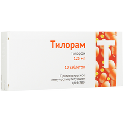 Тилорам - инструкция по применению Торговое наименование препарата: Тилорам Международное непатентованное наименование: тилорон Лекарственная форма: таблетки, покрытые пленочной оболочкой Состав: Состав на одну таблетку: активное вещество: тилорона дигидрохлорид (тилорон)...