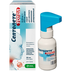 Описание Септолете тотал - это новый лекарственный препарат с уникальным составом* для комплексного лечения боли в горле. Он действует на причину инфекции и устраняет симптомы воспаления такие как: боль покраснение отек нарушение функции. Состав 1 доза спрея/1 мл спрея Действующие вещества:...