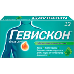 Имеются противопаказания, необходима консультация специалиста Гевискон Таблетки жевательные (мятные)от почти белого до кремового цвета с небольшими вкраплениями, круглые, плоские, со скошенными краями; на одной стороне таблетки - изображение круга и шпаги, на другой - "G 250"; с мятным...