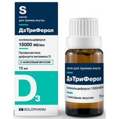 ДэТриФерол 500 МЕ в 1 капле. Торговое наименование: ДэТриФерол Международное непатентованное наименование: колекальциферол Лекарственная форма: капли для приема внутрь Состав 1 мл препарата содержит: Действующее вещество: Колекальциферол 15000 ME (0,375 мг) Вспомогательные...