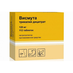 Состав 1 таблетка содержит активное вещество: висмута трикалия дицитрат - 304,6 мг, в пересчете на висмута оксид - 120,0 мг. Показания • функциональная диспепсия, не связанная с органическими заболеваниями желудочно-кишечного тракта; • хронический гастрит и гастродуоденит в фазе обострения,...