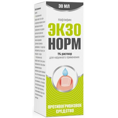 Экзонорм 1% флакон раствор для наружного применения 30 мл - это противогрибковое лекарственное средство для наружного применения. Активен в отношении дерматофитов, дрожжевых грибов (Candida spp., Pityrosporum) и других грибов (например, Sporothrix schenckii). В отношении дерматофитов и...