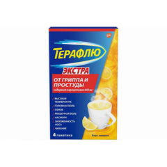 Описание ТераФлю Экстра Лимон — двойная сила против 7 основных симптомов гриппа и простуды. Продукт помогает облегчать выраженные симптомы гриппа и простуды, такие как повышенная температура, озноб, ломота в теле, головная боль, насморк, заложенность носа, чихание. Начинает действовать уже...