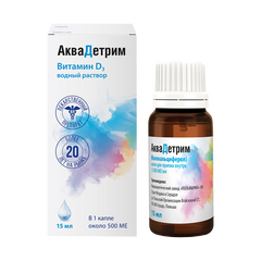 Аквадетрим капли - инструкция по применению Торговое название препарата: Аквадетрим Международное непатентованное название: Колекальциферол Лекарственная форма: капли для приема внутрь. Состав 1 мл раствора (30 капель) содержит: Активные компоненты. Колекальциферол (Витамин D3) - 15 000 ME ....