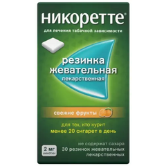 Никоретте 2 мг резинка жевательная лекарственная вкус свежие фрукты - это лекарственный препарат, который уменьшает симптомы синдрома «отмены», возникающих при полном отказе от курения у пациентов, решивших бросить курить; уменьшает количество выкуриваемых сигарет у тех, кто не может или не...