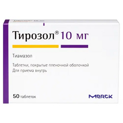 Состав Каждая таблетка содержит: Действующее вещество: тиамазол 10 мг. Вспомогательные вещества: кремния диоксид коллоидный- 2 мг, карбоксиметилкрахмал натрия - 2 мг, магния стеарат - 2 мг, гипромеллоза 2910/15 - 3 мг, тальк - 6 мг, порошок целлюлозы - 10 мг, крахмал кукурузный - 20 мг, лактозы...