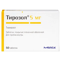 Антитиреоидное средство. Блокирует пероксидазу и нарушает йодирование гормонов щитовидной железы. Состав 1 таблетка содержит: Действующее вещество: тиамазол 5 мг Вспомогательные вещества: кремния диоксид коллоидный - 2 мг, карбоксиметилкрахмал натрия - 2 мг, магния стеарат - 2 мг,...