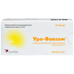 Уро-Ваксом - инструкция по применению ИНСТРУКЦИЯпо медицинскому применению препарата Общепринятое научное название: Лиофилизированный лизат бактерий Escherichia coli. Состав на 1 капсулу: Активное вещество: лиофилизированный лизат бактерий Escherichia coli 6 мг; Вспомогательные...