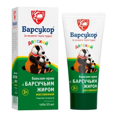 Барсукор бальзам-крем массажный детский - нежный крем светло-бежевого цвета с нестойким ментоловым ароматом на основе барсучьего жира. Крем эффективен в качестве вспомогательного разогревающего средства при симптомах простуды, при переохлаждении. Обеспечивает увлажнение и смягчение кожи в...