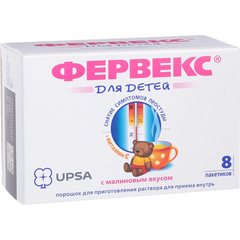 Описание Фервекс для детей порошок для приготовления раствора для приема внутрь малина с сахаром 8шт применяют для симптоматического лечения острых респираторных заболеваний. В состав детского Фервекса входят парацетамол, который понижает температуру тела и снимает болевые ощущения, и...