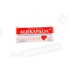 Условия отпуска из аптек Без рецепта врача. Описание продукта, инструкция. Регистрационный номер: ЛС-000680 от 30.12.05 г. Торговое название: Ацекардол Международное непатентованное название: ацетилсалициловая кислота Лекарственная форма: таблетки, покрытые...