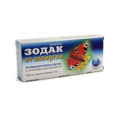 Действующее вещество:   Цетиризин* (Cetirizine*) Фармакологическая группа Противоаллергическое средство — H1-гистаминовых рецепторов блокатор [H1-антигистаминные средства] Нозологическая классификация (МКБ-10) H10.1 Острый атопический конъюнктивит J30 Вазомоторный и аллергический...