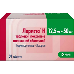 Описание Гипотензивное, диуретическое, вазодилатирующее средство.  Состав 1 таблетка, покрытая пленочной оболочкой, содержит: Ядро: Действующие вещества: Гидрохлоротиазид - 12,50 мг; Лозартан калия - 50,00 мг; Вспомогательные вещества: Крахмал прежелатинизированный, целлюлоза...