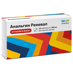 Анальгин 500мг таблетки RENEWAL Регистрационный номер: ЛС-000487 Торговое наименование: Анальгин Реневал Международное непатентованное наименование: метамизол натрия Лекарственная форма: таблетки Состав Действующее вещество: метамизол натрия 500,00 мг; вспомогательные вещества: повидон К 30,...