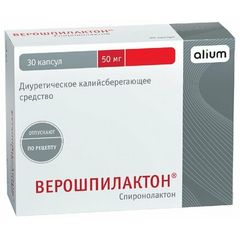 Состав и описание Активное вещество: 1 капсула содержит: спиронолактон - 50 мг Вспомогательные вещества: Лактозы моногидрат, крахмал картофельный, повидон, натрия лаурилсульфат, кремния диоксид коллоидный (аэросил), тальк, магния стеарат; Корпус капсулы: титана диоксид, желатин;...