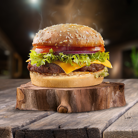 Большая сочная котлета из 100% говядины, ломтик сыра, соленый огурчик, свежие лист салата, помидор, лук и специальный соус «BBQ»