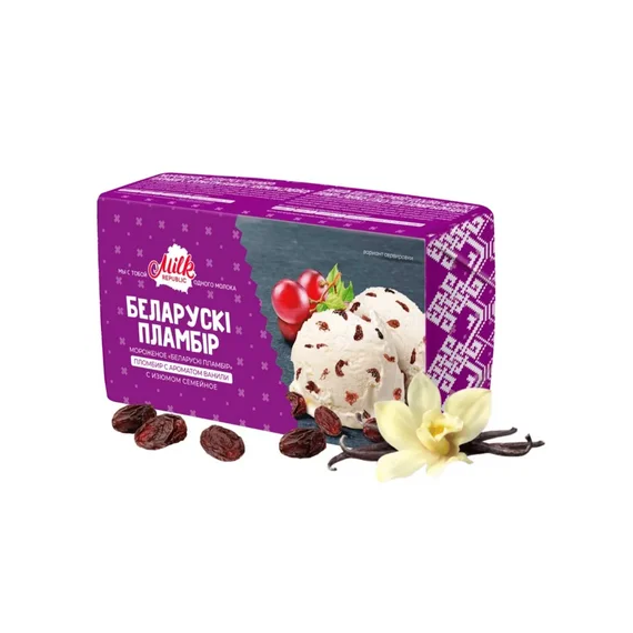 "Беларуси пламб!р" пломбир с ароматом ванили с изюмом в брикете на вафлях 100г 1/30