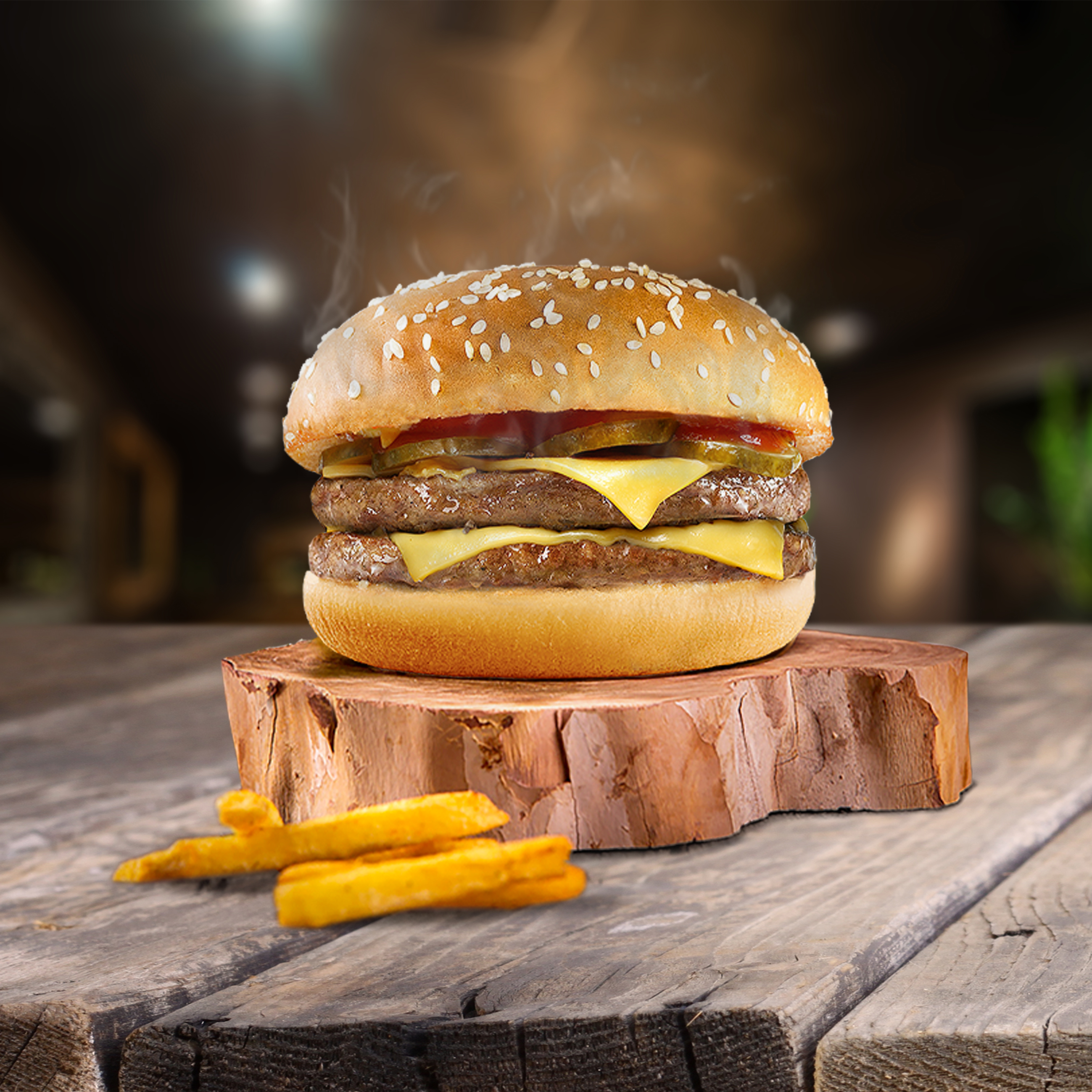 Аппетитный бургер с двумя большими говяжьими котлетами, кетчупом, горчицей, двойной порцией сыра, солеными огурчиками и луком