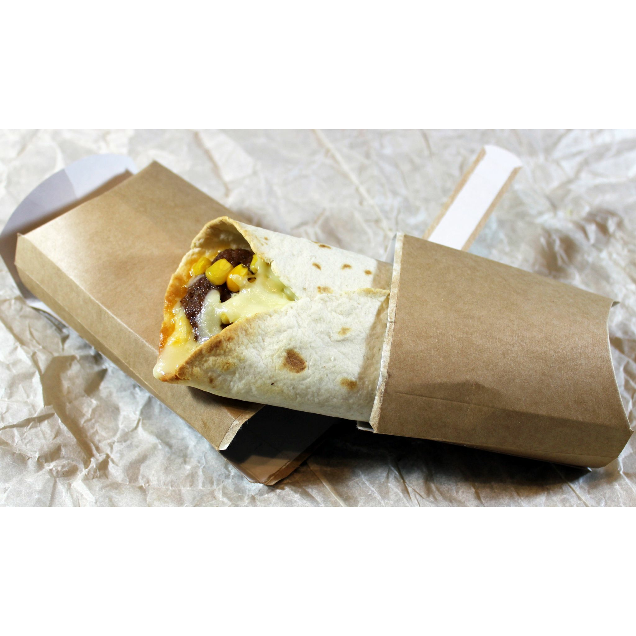 Лепешка тортилья, говяжий фарш с соусом, кукуруза, сыр Моцарелла.