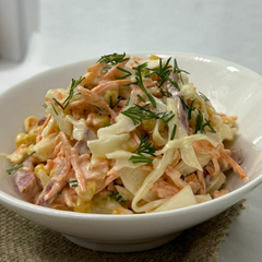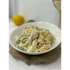 Состав: Кальмары, яйцо кур., майонез, огурец свежий, лук репчатый, кукуруза консерв., уксус 9%,масло раст, сахар-песок, соль пищевая, перец черный молотый