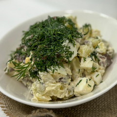 Состав: Майонез, картофель, мясо говядина, яйцо куриное, горошек зеленый консервированный, огурцы маринованные, лук репчатый красный, укроп свежий, соль пищевая, перец черный молотый.
