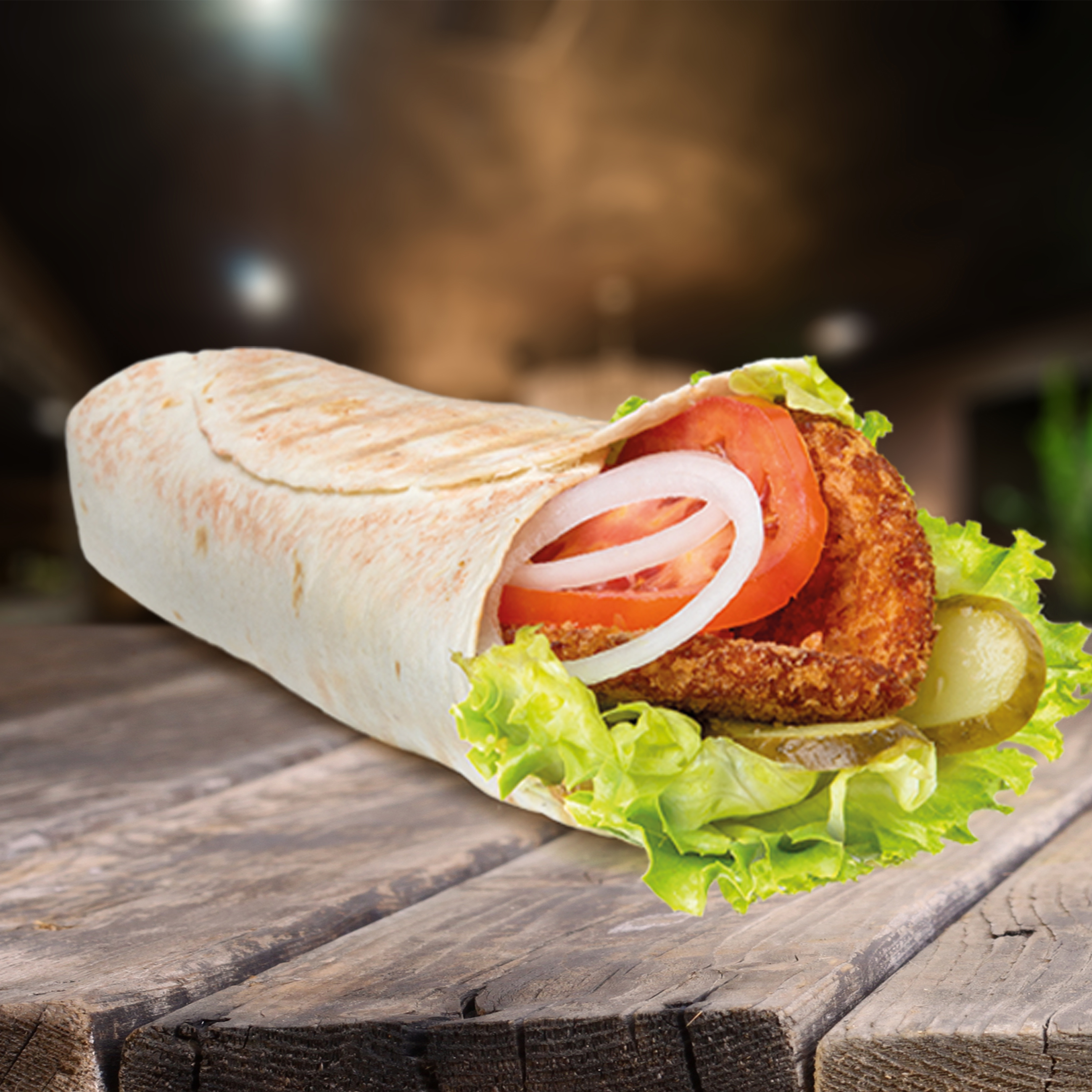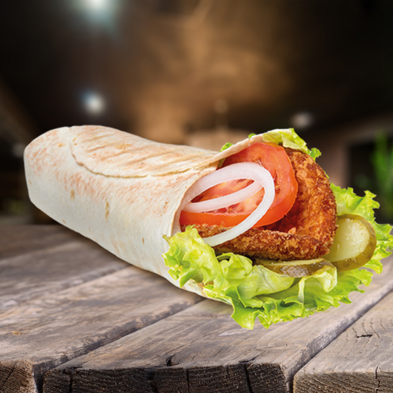 Куриная котлета, соленые огурчики, салат, помидор и лук с ароматным чесночным соусом, завернутые в пшеничную тортилью