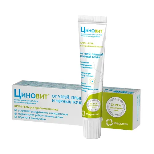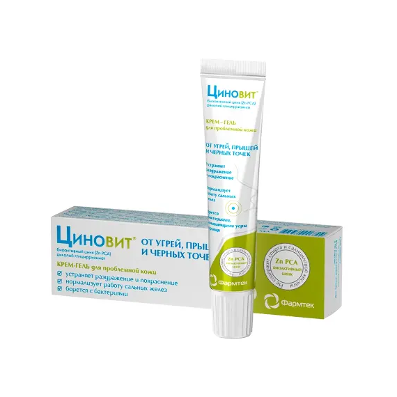 Бренд ЦИНОВИТ - подходит для всей семьи. Разработан дерматологами. Гипоаллергенная формула.ЦИНОВИТ КРЕМ-ГЕЛЬ ДЛЯ ПРОБЛЕМНОЙ КОЖИ - инновационная формула с биоактивным цинком (zinc PCA) и дикалиий глицирризинатомАктивные компоненты:Влияние компонентов ЦИНОВИТ крем-геля на кожуБИОАКТИВНЫЙ Zn (Zinc PCA), 1 (ингибирует 5-альфаредуктазу, снижает уровень активного тестостерона в волосяных фоликулах и сальных железах):Снижает уровень выделения кожного салаУлучшает отток кожного сала за счет снижения его вязкости и повышения эластичности стенок волосяного фолликулаДоказанное антибактериальное действие против Propionibacterium acnes, Staphylococcus epidermidis, Staphylococcus aureus, Pseudomonas aeruginosa, Escherichia coli.ДИКАЛИЙ ГЛИЦИРРИЗИНАТ, (активный компонент корня солодки)Доказанная противовоспалительная активность по силе сравнимая с кортизоломВитамин АСнижает секрецию сальных желез Уменьшает ороговение устьев волосяных фолликул Облегчает отток кожного салаВитамин ЕАнтиоксидантное действиеКомплексный подход к устранению угрей, прыщей и комедонов (черных точек):-Нормализует обмен кожного сала-Борется с воспалением-Борется с бактериями-Улучшает структуру кожи-Не сушит кожу (не содержит спирта, салициловой кислоты и гормонов)КАК ВОЗНИКАЮТ УГРИ И ПРЫЩИ.Основной причиной образования прыщей и угрей является увеличение продукции кожного сала и нарушение его оттока из сальных желез вследствие избыточного гормонального влияния. Кожное сало заполняет полость сальной железы, образуя округлые возвышения на поверхности кожи. Это и есть прыщи, которые часто воспаляются из-за активного размножения бактерий.Как ЦИНОВИТ крем-гель борется с угрями и прыщами. Для успешной борьбы с прыщами необходимо нормализовать работу сальных желез, восстановить нормальный отток кожного сала, устранить возможность размножения бактерий и снять воспаление.Состав ЦИНОВИТ крем-геля подобран таким образом, чтобы успешно решить все эти задачиСпециальные особенности: Не содержит отдушек, красителей и белков.