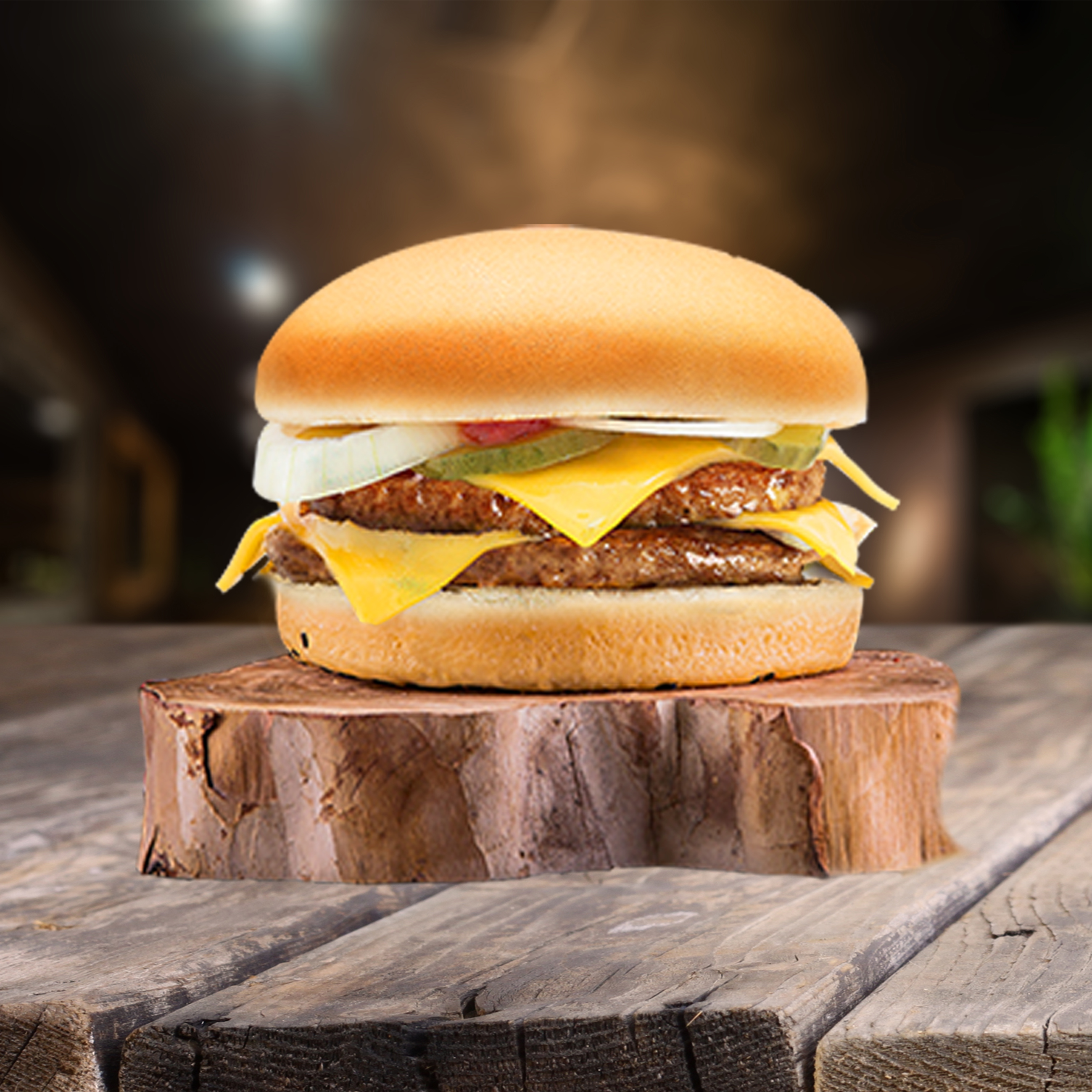 Две сочных котлеты из 100% говядины с кетчупом, горчицей, с двойной порцией сыра, солеными огурчиками и луком