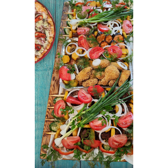 Шашлык из свинины с картофелем на деревянных шампурах, курица в духовке с картофелем, хрустящие крылышки в панировке, красная рыба, свежие овощи.