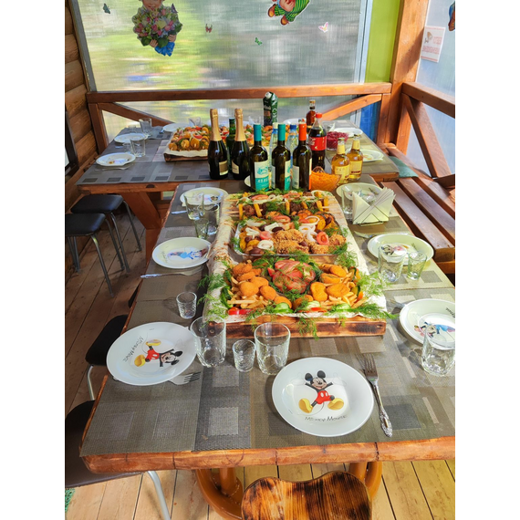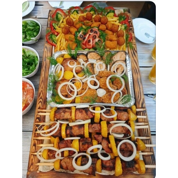 Шашлык из свинины с картофелем на деревянных шампурах, красная рыба на гриле, курица в духовке с картофелем, хрустящие крылышки в панировке, свежие овощи, картофель фри, наггетсы куриные. Предзаказ за сутки