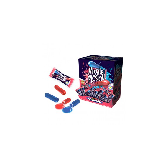 Жевательная резинка Fini Взрыв ракеты синего и красного цветов в форме капсулы, внутри вас ждет супер кислая вишневая и ягодная начинка. Синий цвет жевательной резинки красит язык в синий цвет.