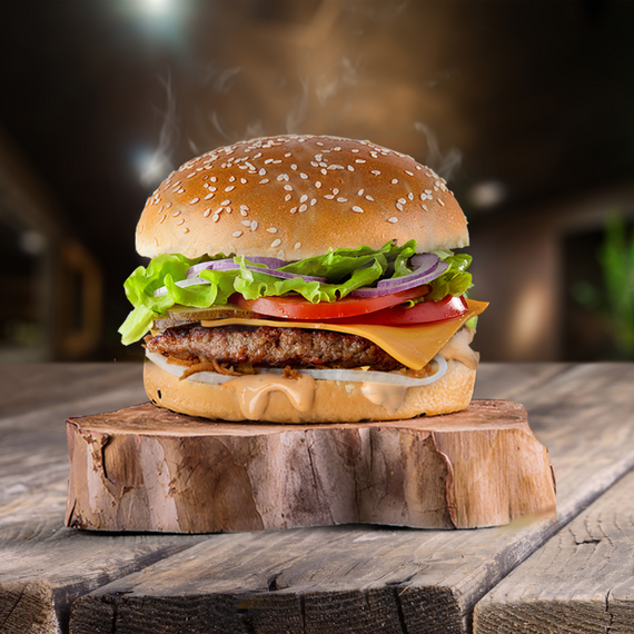 Бургер с сочной котлетой из 100% говядины со свежими огурцами, помидором, листом салата, луком свежим и жареным под специальным соусом «Бургер»