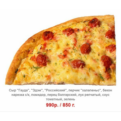 Сыр "Гауда", "Эдэм", "Российский", перчик "халапеньо", бекон нарезка с/к, помидор, перец болгарский, лук репчатый, соус томатный, зелень