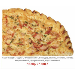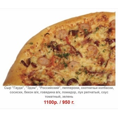 Сыр "Гауда", "Эдэм", "Российский", пепперони, охотничьи колбаски, сосиски, бекон в/к, говядина в/к, помидор, лук репчатый, соус томатный, зелень