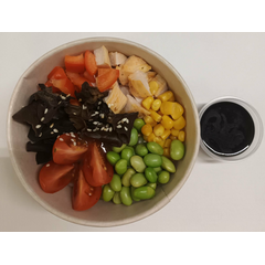 рис,куриное филе в/к,бобы мукимаме,перец болгарский,древесные грибы,помидоры черри,кукуруза,соус кислосладкий,кунжут,соус ореховый