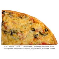 Сыр "Гауда", "Эдэм", "Российский", пепперони, охотничьи колбаски, сосиски, бекон в/к, говядина в/к, помидор, лук репчатый, соус томатный, зелень. Вес 950 гр.