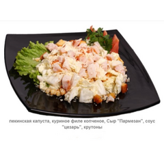 Пекинская капуста, куриное филе копченое, Сыр "Пармезан", соус "цезарь", крутоны. Вес 150/50 гр.