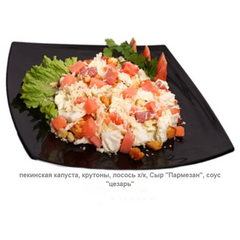 Пекинская капуста, крутоны, лосось х/к, Сыр "Пармезан", соус "цезарь". Вес 150/50 гр.