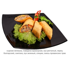Сырная лепешка, говядина мраморная, лук репчатый, перец болгарский, сметана, лук зеленый, специи, смесь прованских трав. Вес 215 гр.