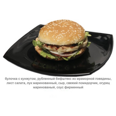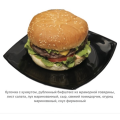 Булочка с кунжутом, рубленный бифштекс из мраморной говядины, лист салата, лук маринованный, сыр, свежий помидорчик, огурец маринованный, соус фирменный. Вес 350 гр.