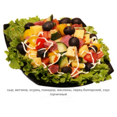 Сыр, ветчина, огурец, помидор, маслины, перец болгарский, соус горчичный. Вес 210/30 гр.