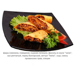 Фарш (свинина, говядина), сырная лепешка, фасоль в соусе "чили", лук репчатый, перец болгарский, кетчуп "heinz", сыр, смесь прованских трав, специи. Вес 250 гр.