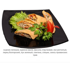 Сырная лепешка, куриное филе, фасоль стручковая, лук репчатый, перец болгарский, лук зеленый, сметана, специи, смесь прованских трав. Вес 250 гр.