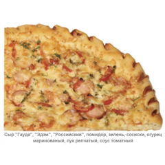 Сыр "Гауда", "Эдэм", "Российский", перчик "халапеньо", бекон нарезка с/к, помидор, перец болгарский, лук репчатый, соус томатный, зелень