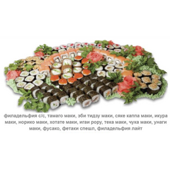 филадельфия с/с, тамаго маки, эби тидзу маки, сяке каппа маки, икура маки, норико маки, хотате маки, игаи рору, тека маки, чука маки, унаги маки, фусако, фетаки спешл, филадельфия лайт Вес 2000 гр.